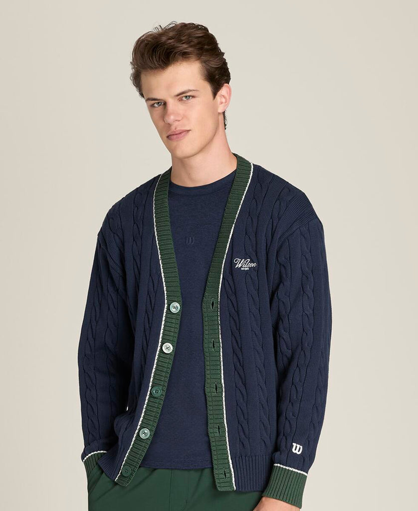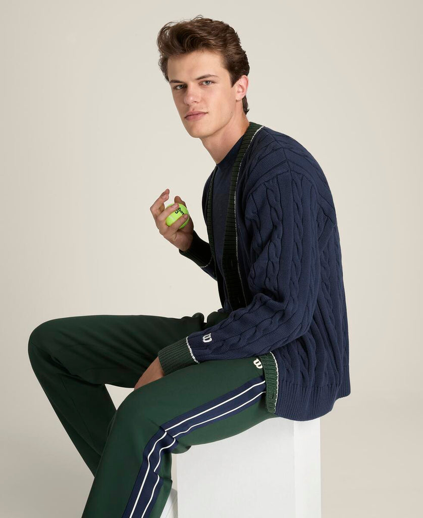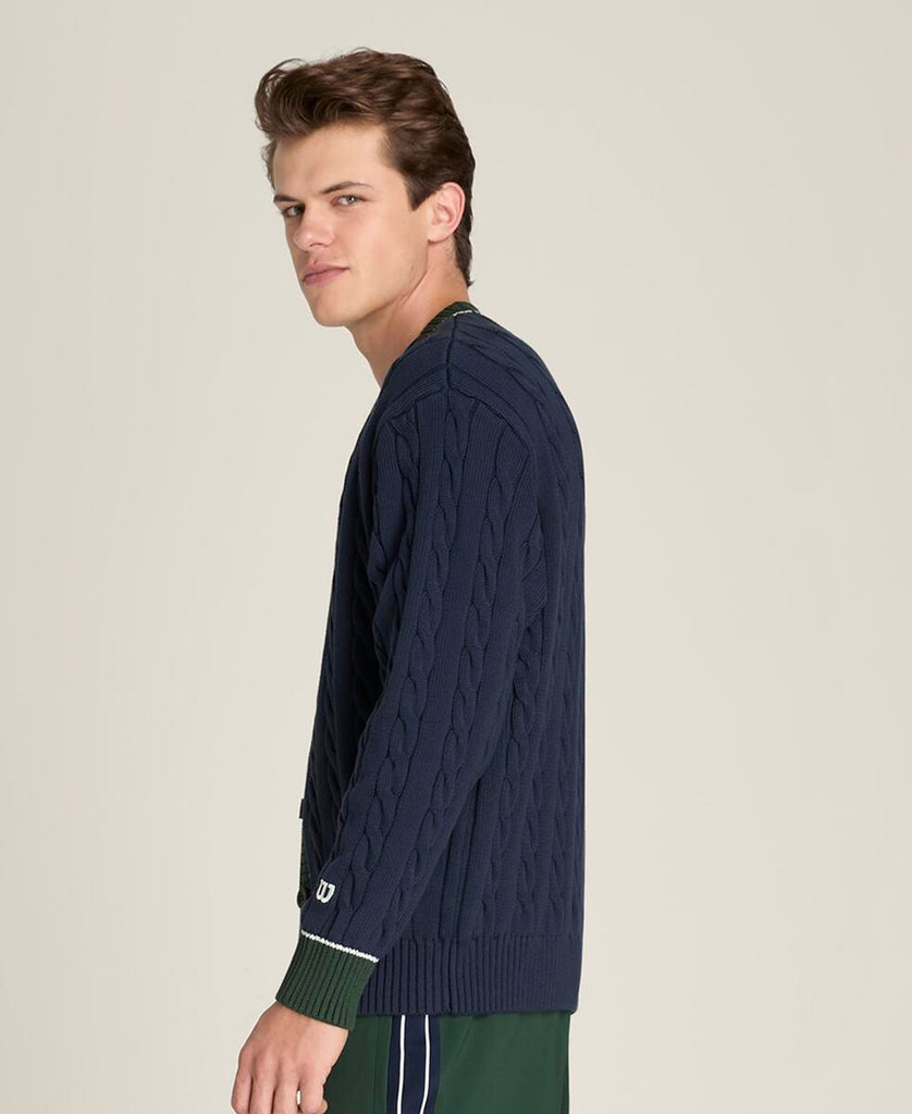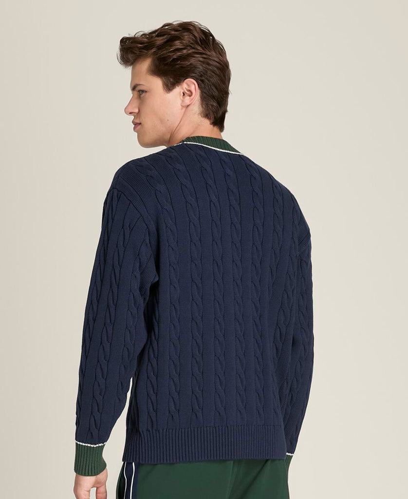 クラシックな上品さとモダンなシルエットを融合。やわらかなケーブルニット素材を使用し、テニスの伝統的な美学を感じさせる仕上がり。
