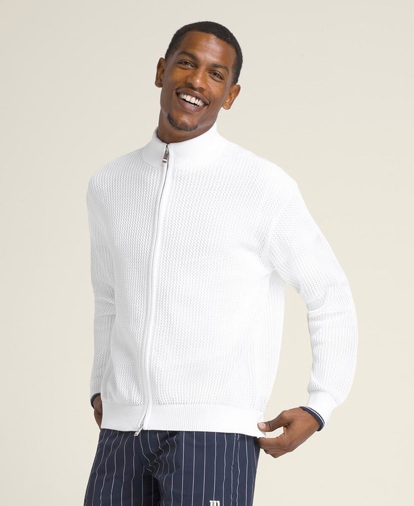 クラシックなボンバージャケットを現代風にアレンジした一着。全面ニット仕様に加え、暖かいキルティングのダックダウンを使用し、快適さと保温性を兼ね備えている。襟、袖口、裾のコントラストカラーがアクセントに。