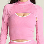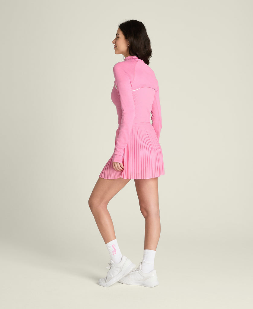 肩から腕をカバーするテニス用シュラッグ。UPFプロテクション付きの吸湿速乾素材を採用し、強い日差しの下でもドライな着心地。スリムフィット&超クロップド丈で、ブラやブラミの上にフィットし、動きを妨げない設計。ボンディング加工のサムホール付きで、袖のズレを防ぎながらスムーズなスイングをサポート。