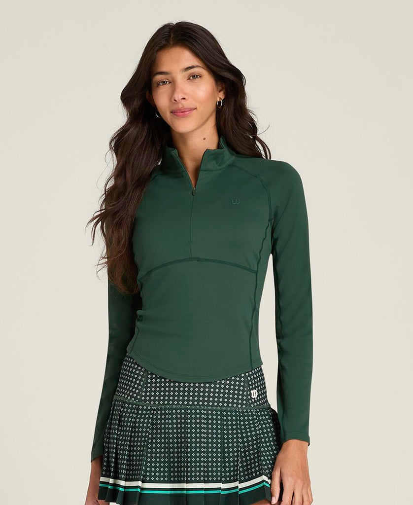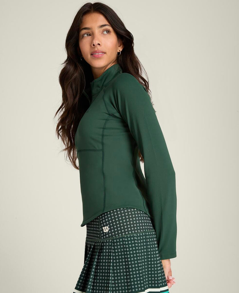涼しい季節のプレーに最適な、機能性に優れたテクニカルトップ。厚みのあるソフトな素材が、速乾性・UVカット性を備え、単体でもレイヤードでも活躍。首元は後ろを高めに設計し、日差しから守る。脇下の立体縫製が摩擦を軽減し、快適な着用感をサポート。