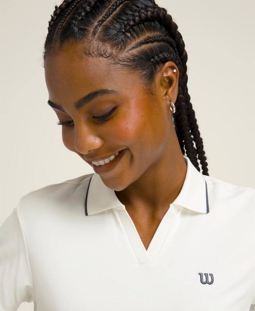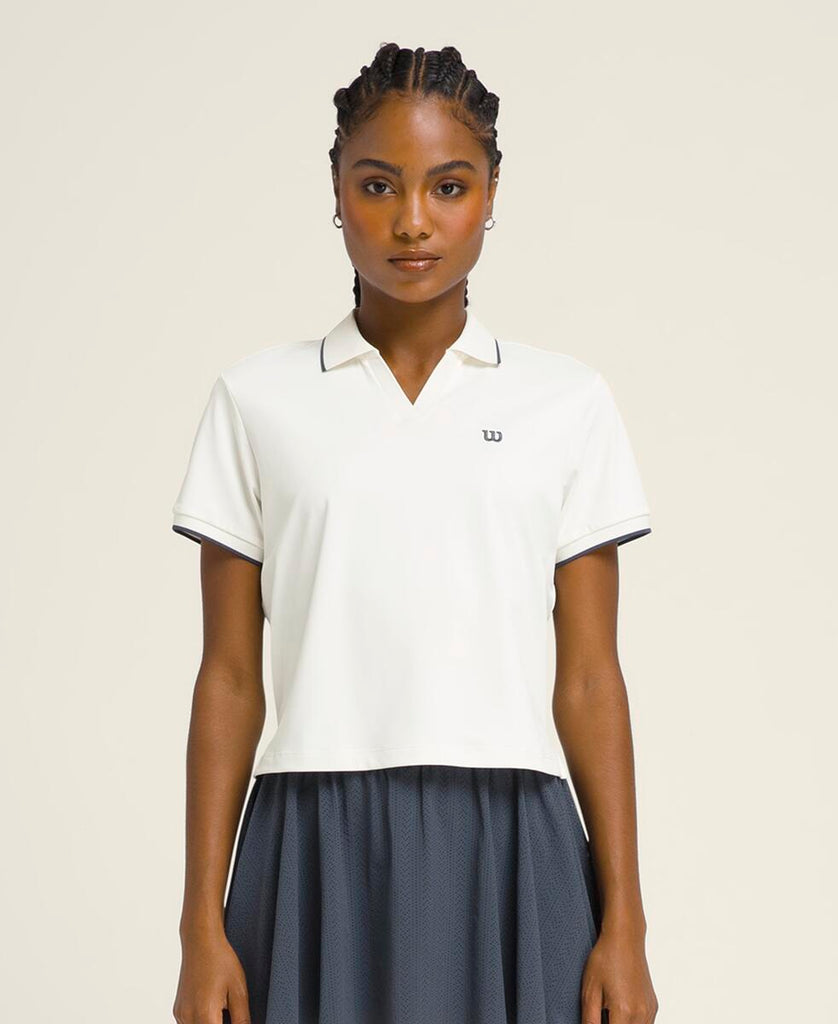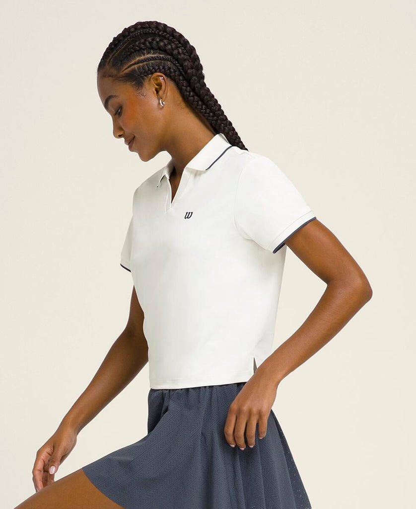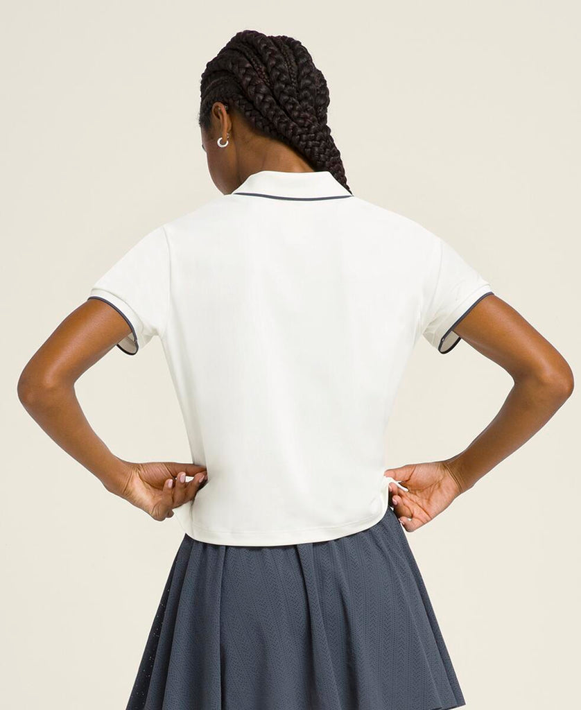 柔らかいリブ素材で速乾性があり、肌に心地よい涼しさを与える。白のトリムカラーがレトロなアクセントを添え、スリムでクロップド丈のシルエットは、プリーツテニススカートからゆったりパンツまで幅広くコーディネートできる。