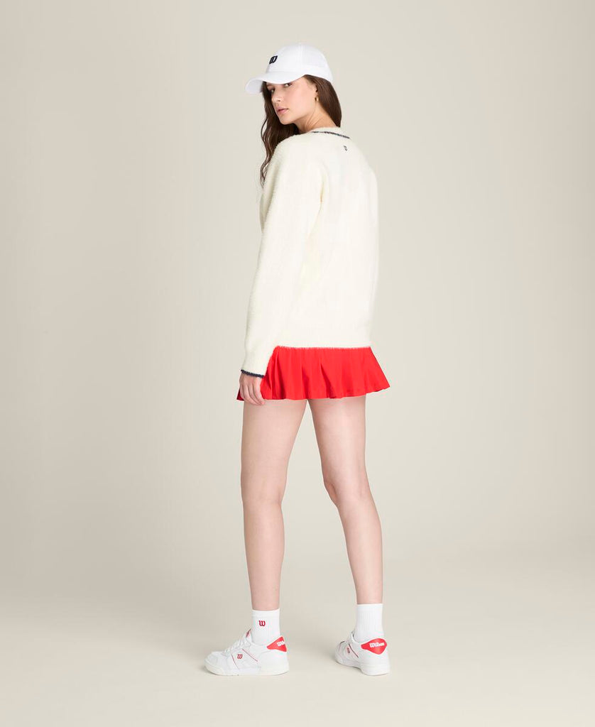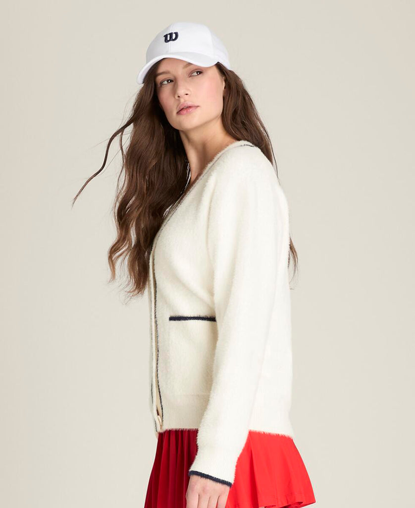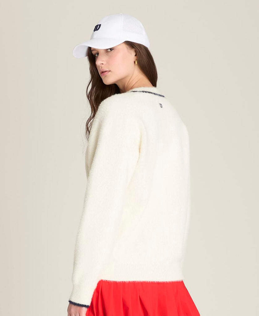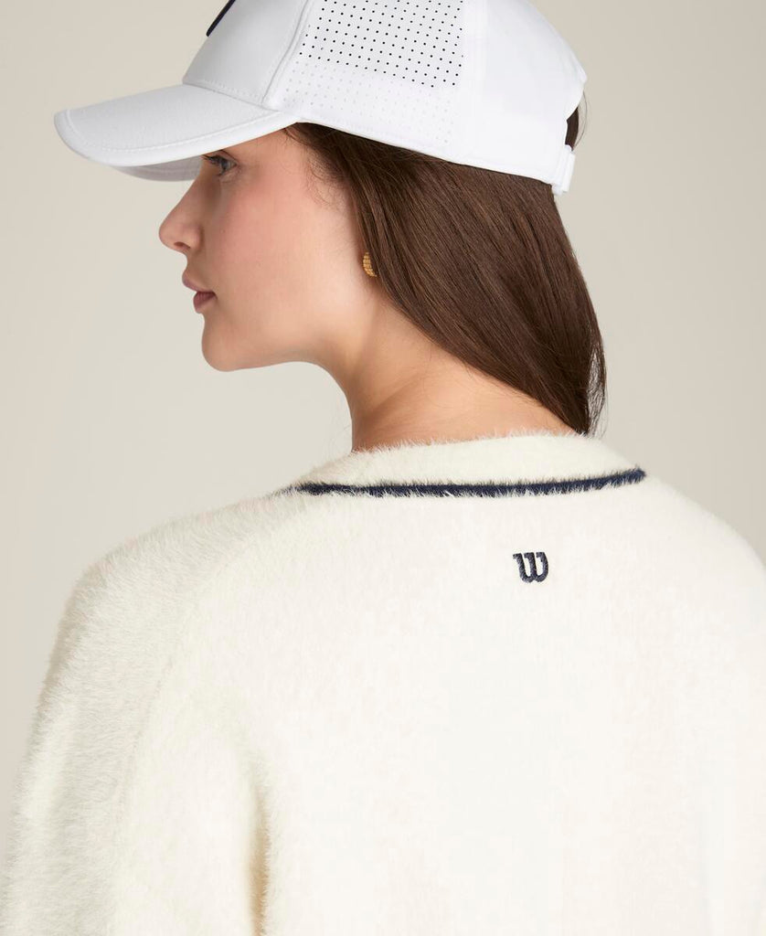 テニスウェアにもデイリーウェアにも重ねやすい、ゆったりとしたリラックスフィット。ふんわりとした軽やかなニット素材は通気性にも優れ、プレー後のクールダウン時にも快適な着心地。