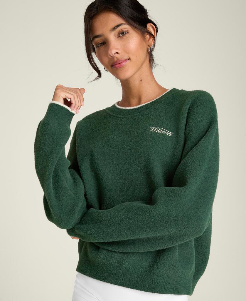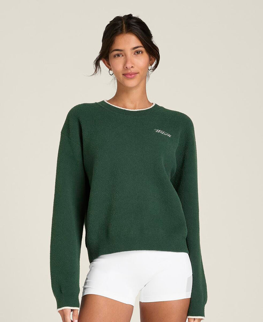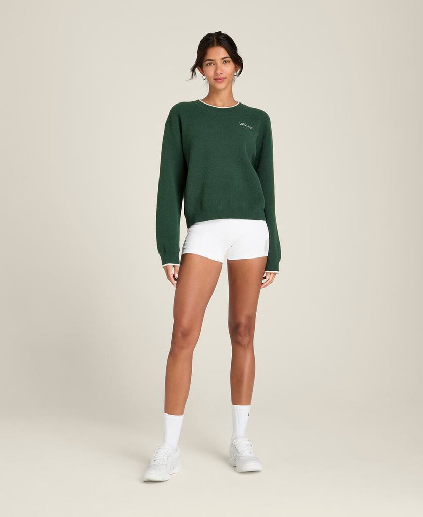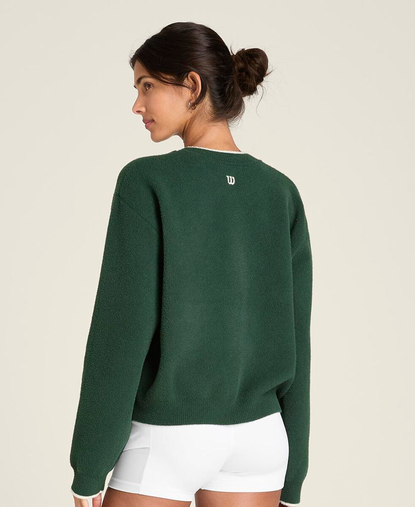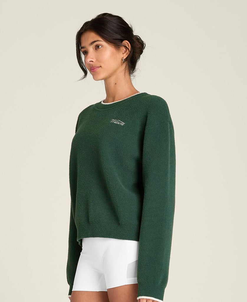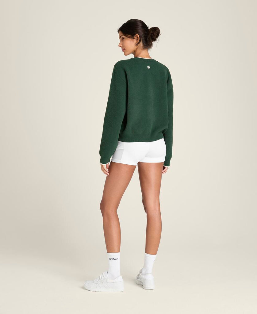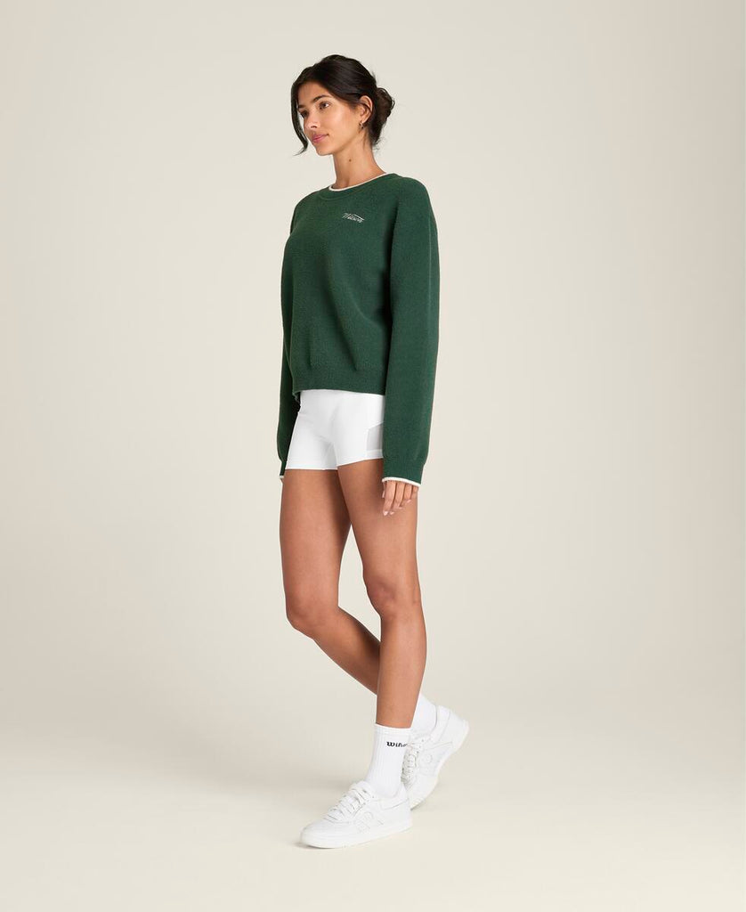カジュアルな快適さを引き出すクルーネックニット。高めの裾丈とゆるやかなシルエットが、テニススカートやデニムと好相性。ワイドリブが全体をすっきりまとめ、練習前後にも気軽に羽織れる。