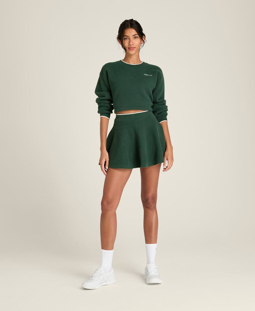 テニススタイルの定番、スカートをニット素材でアップデート。セーターのように柔らかな肌ざわりと、クラシックなシルエットが特徴。オンコートはもちろん、日常にも溶け込む上品な一枚。