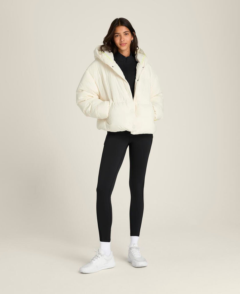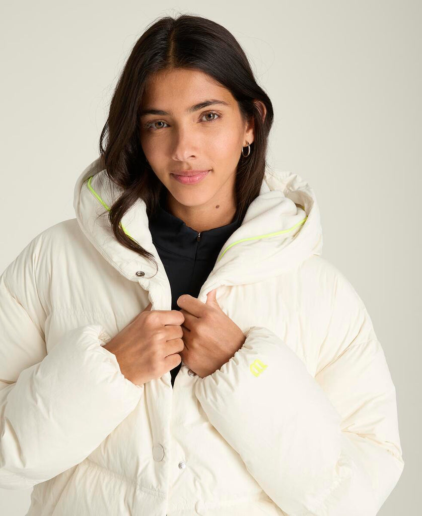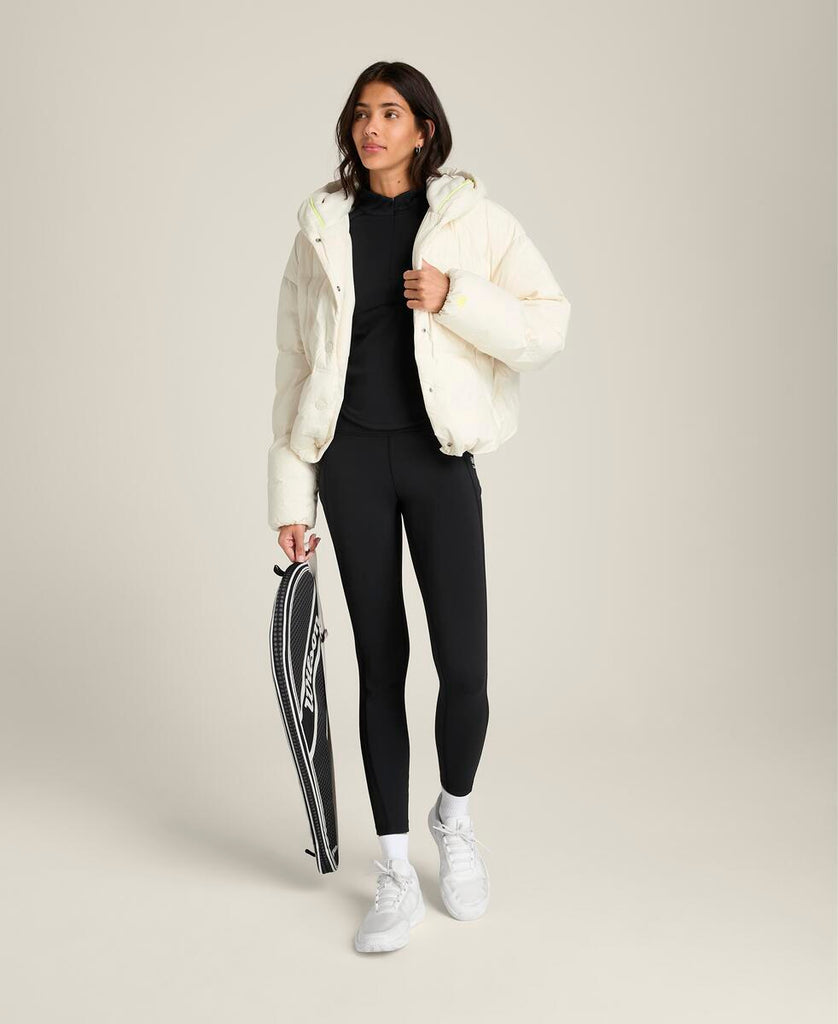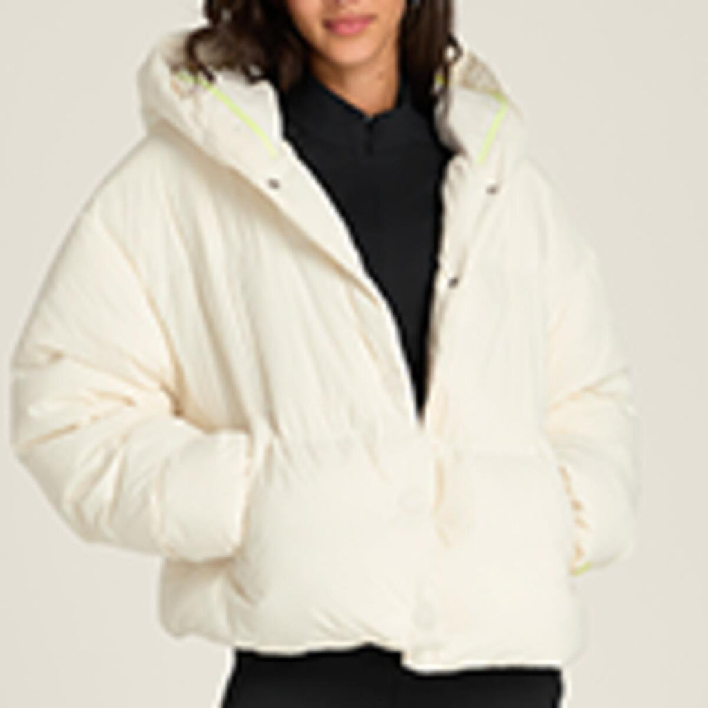 コートの行き帰りにも活躍する、保温性に優れたフード付きジャケット。フリース裏地仕様、撥水素材を使用。フロントジップポケット、内ポケット、裾のドローコード付き。