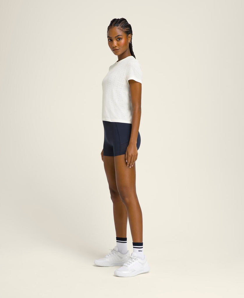 速乾性があり、防臭機能を備え、動きに合わせて伸びるテクニカルTシャツ。シームレスな構造で肌触りは滑らか。繊細なポイントレース編みがデザイン性を高めながら、プレー中の必要な通気性も確保する。
