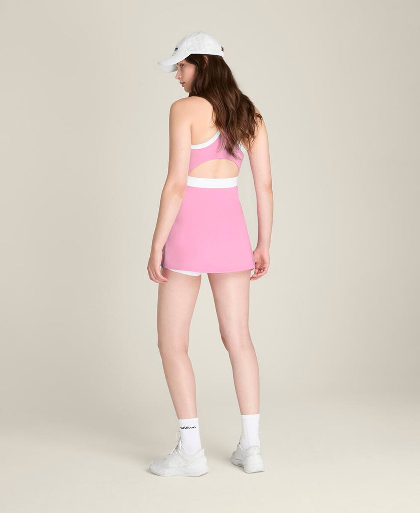 すっきりとした前面のデザインと、スリット入りのスカートを組み合わせたテニスドレス。肩甲骨の動きを妨げないレーサーバックと、サポート力を高める幅広のホルダーストラップを採用。取り外し可能なカップ付きブラを内蔵し、背面のカットアウトで通気性を確保。別売りのインナーショーツとの重ね着にも適した、裏地を最小限に抑えた仕様。