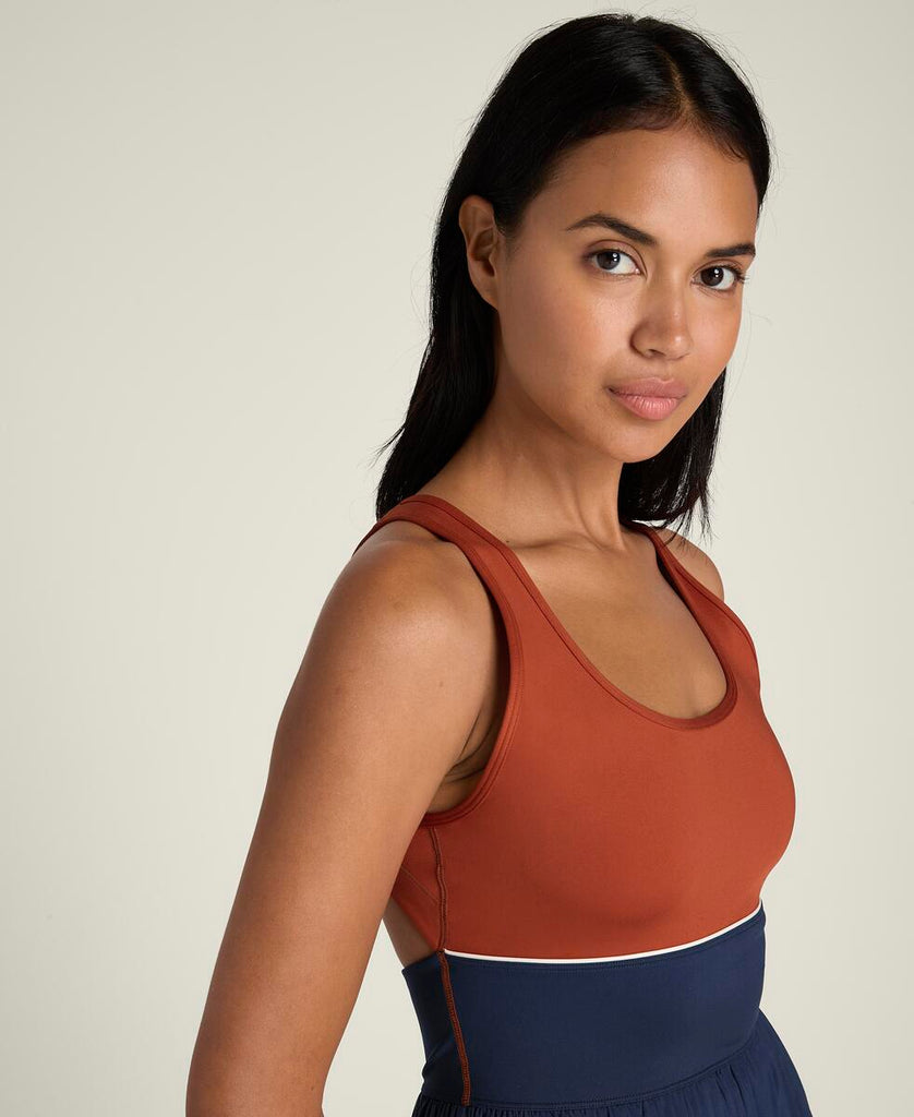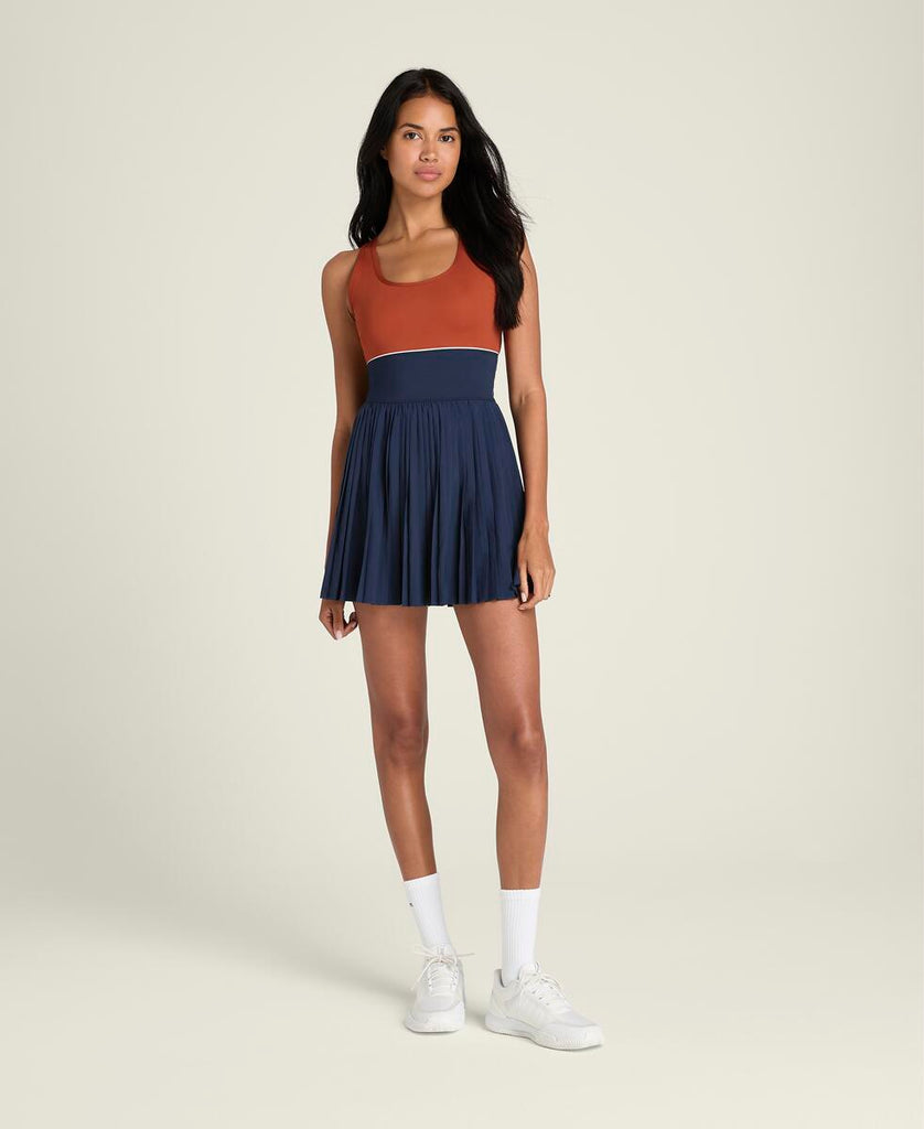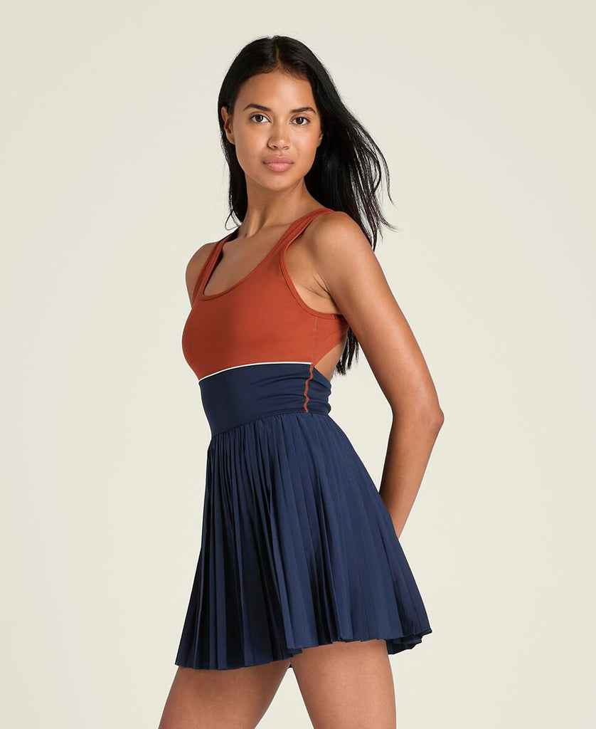 ベアバックデザインのテニスドレス。上半身をホールドしつつ、動きのあるプリーツスカートを採用、バストカップ、ボール収納ショーツを備えた、機能性抜群なワンピース。