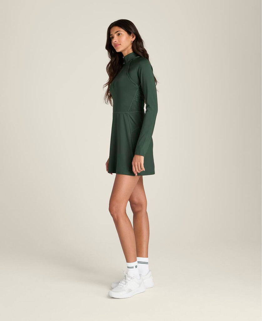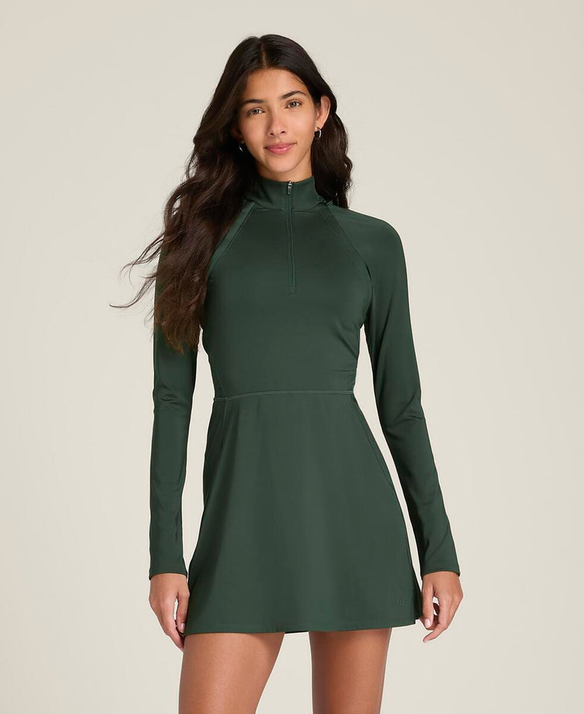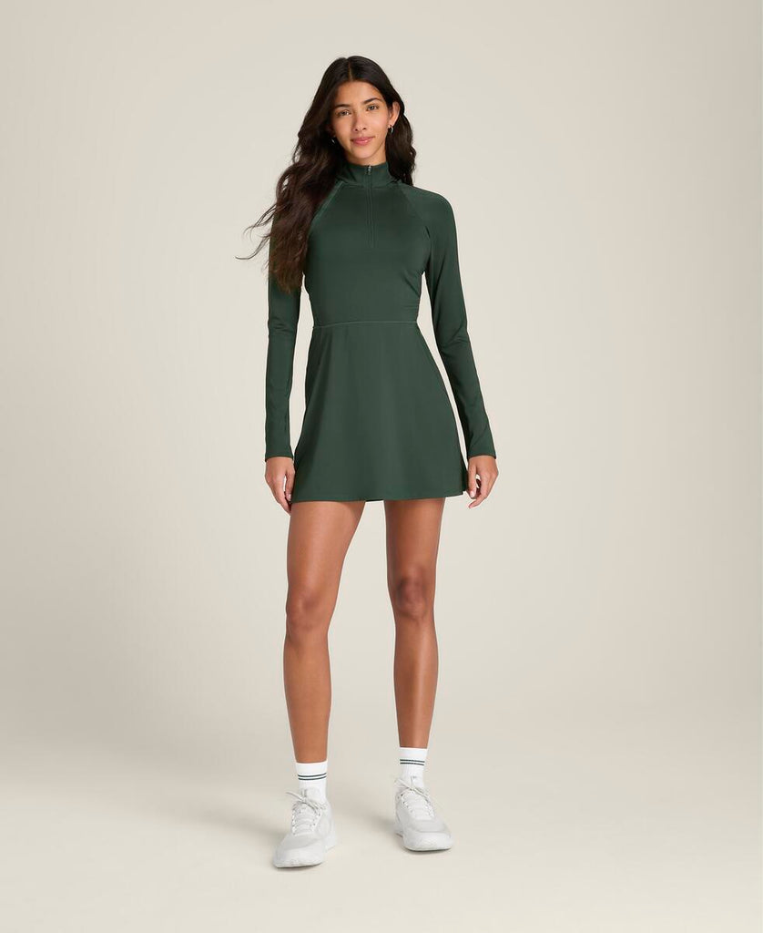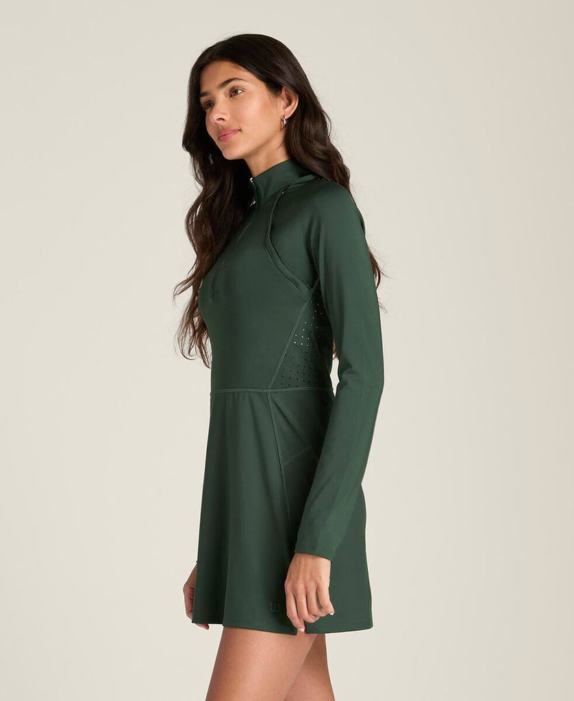 変わりやすい天候に最適な2WAYテニスドレス。肌寒いシーンではシュラッグを着用し、日中温かくなればジッパーで外せる。身体にフィットし、背面には通気性を確保するためのパーフォレーションが施されている。お気に入りのライナーショーツと組み合わせを楽しめる(*アンダースコートは付属されておりません)