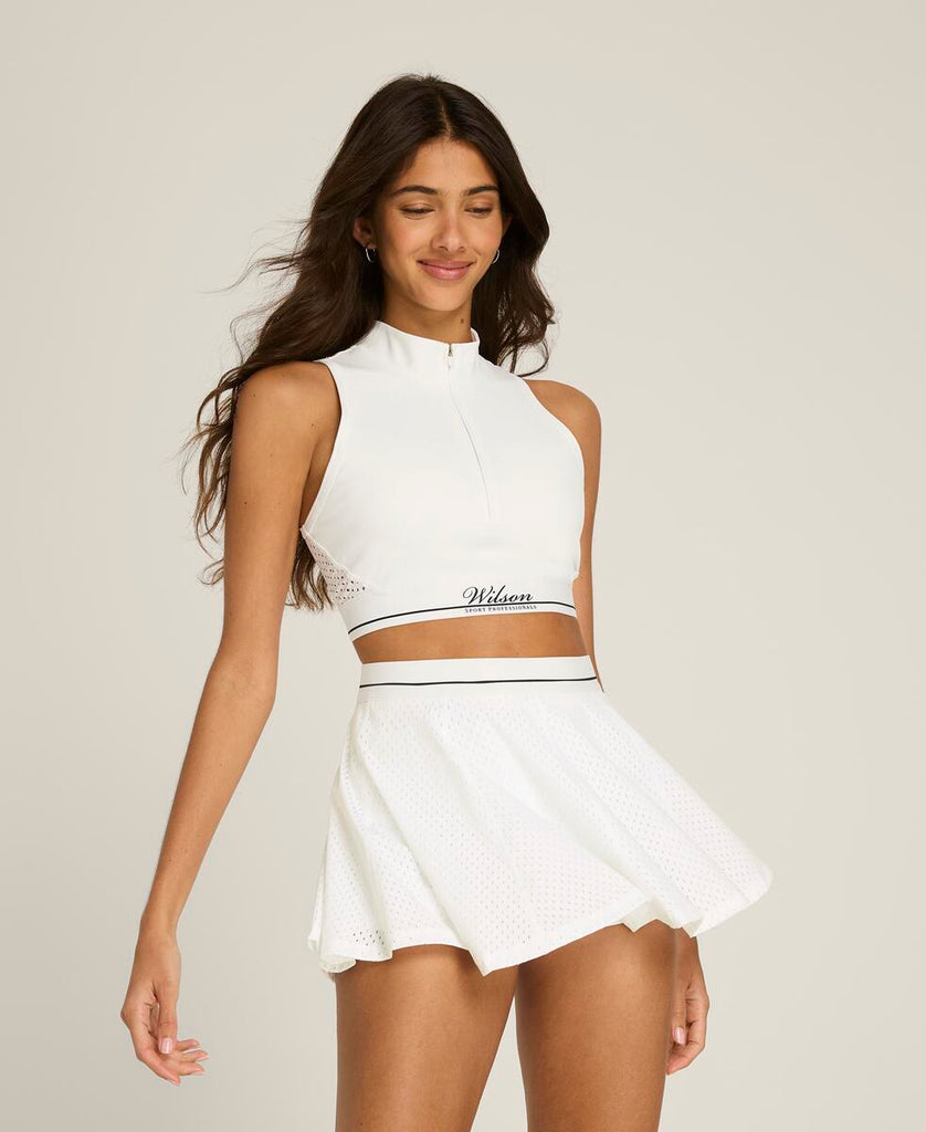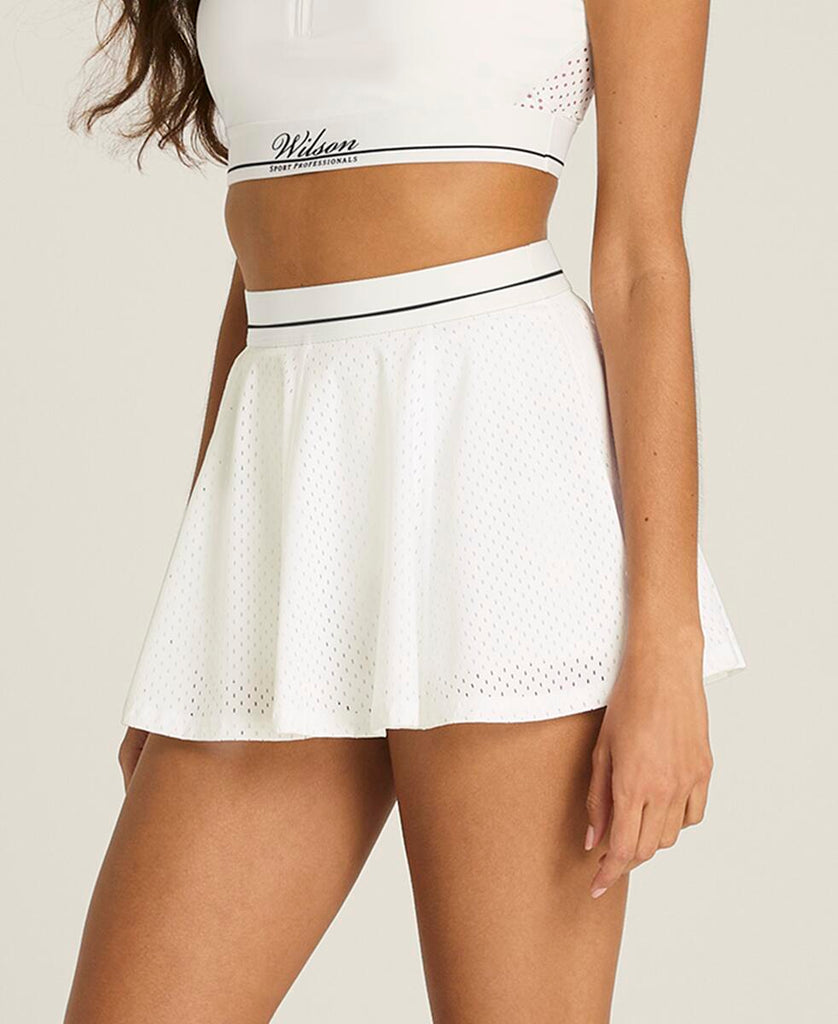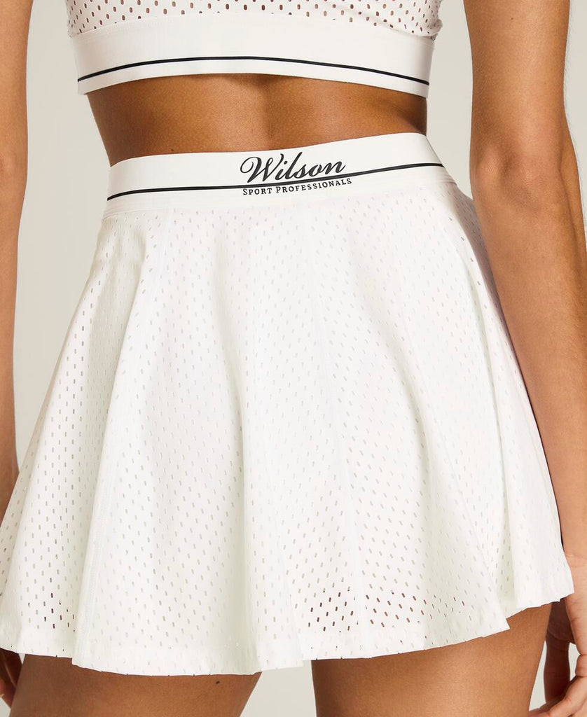 通気性のあるリサイクルナイロン製のテニススカート。UVカット機能、伸縮性のある生地、ボールを収納できるインナー付き。暑い日でも快適でドライな着心地をキープ。