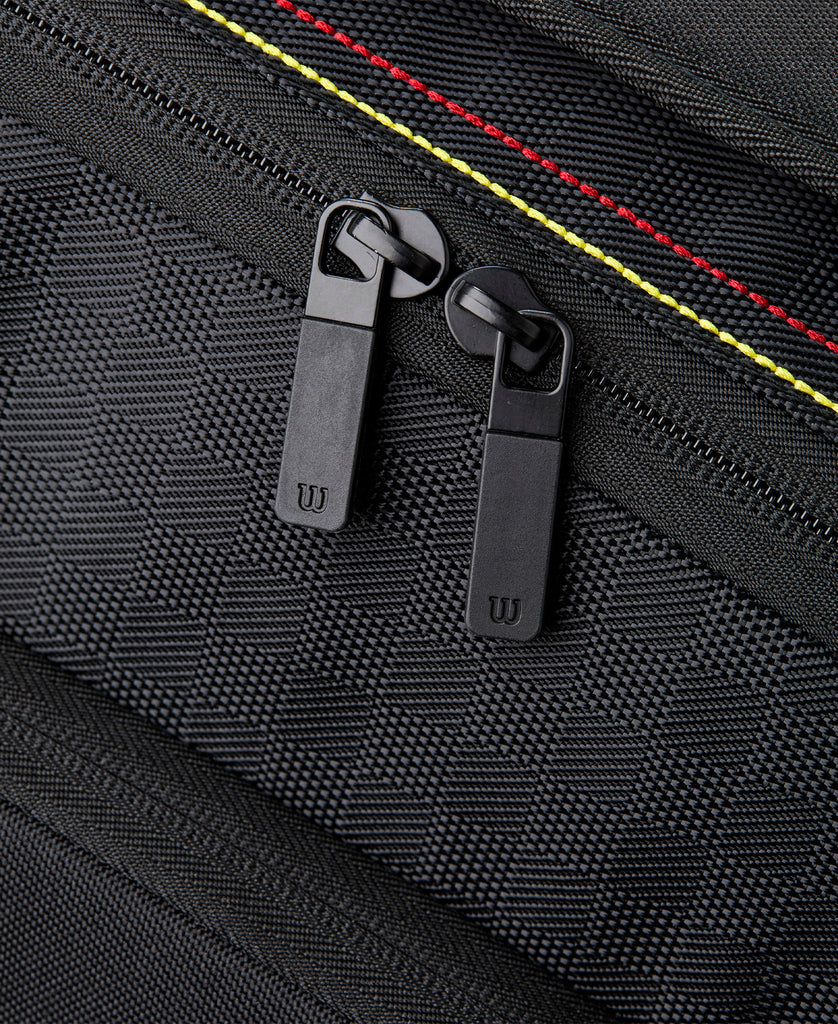 メインポケットは2室構造で、ラケットを最大12本まで収納可能。両サイドには小物を整理しやすい大型アウトポケットを配置し、通気性に配慮したジッパー付きシューズポケットも有。無駄を削ぎ落としたブラックベースのデザインに、レッドロゴとラインが映える、PRO STAFFのDNAを感じさせる佇まい。機能性と存在感を両立した、コートでも移動中でも映えるラケットバッグ。